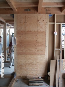 プラスターボードの下地に構造用合板を土台から梁にかかるよう、