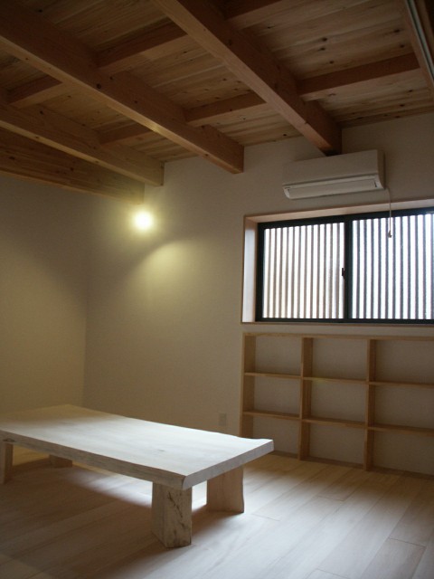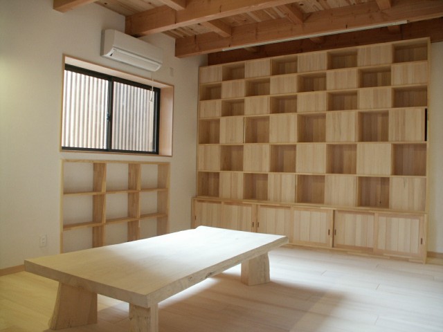 リビングには、イチョウの座卓と本棚を造り付けさせて