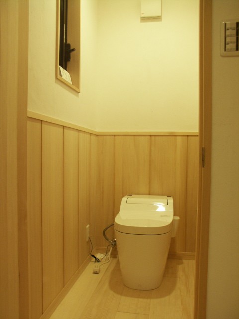 トイレも珪藻土と樅の腰板張りの仕上げ。アンモニア臭はまったくありません。