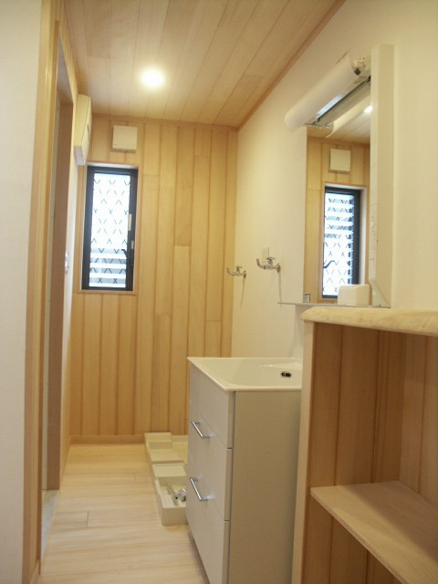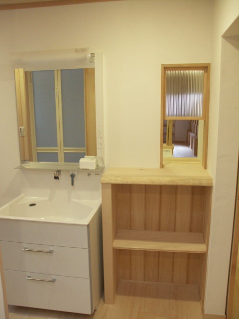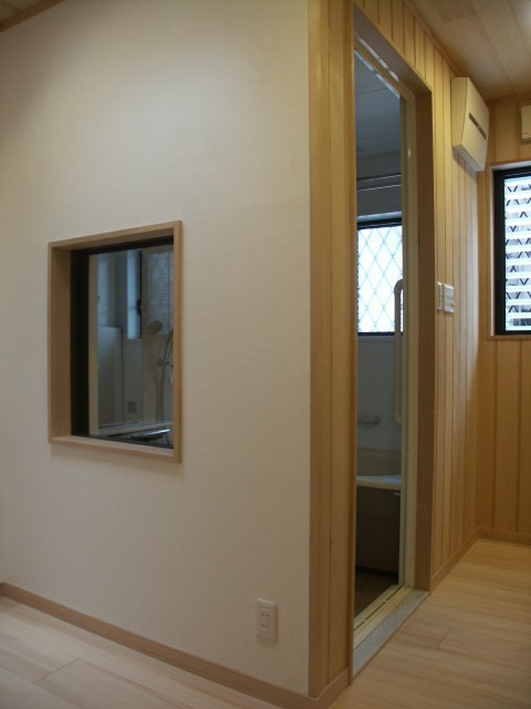 洗面脱衣室からキッチンの方に向かって通風用に上げ下げ窓が配置されています。