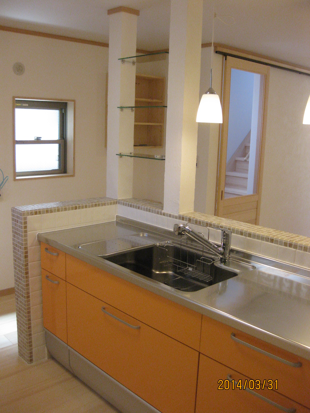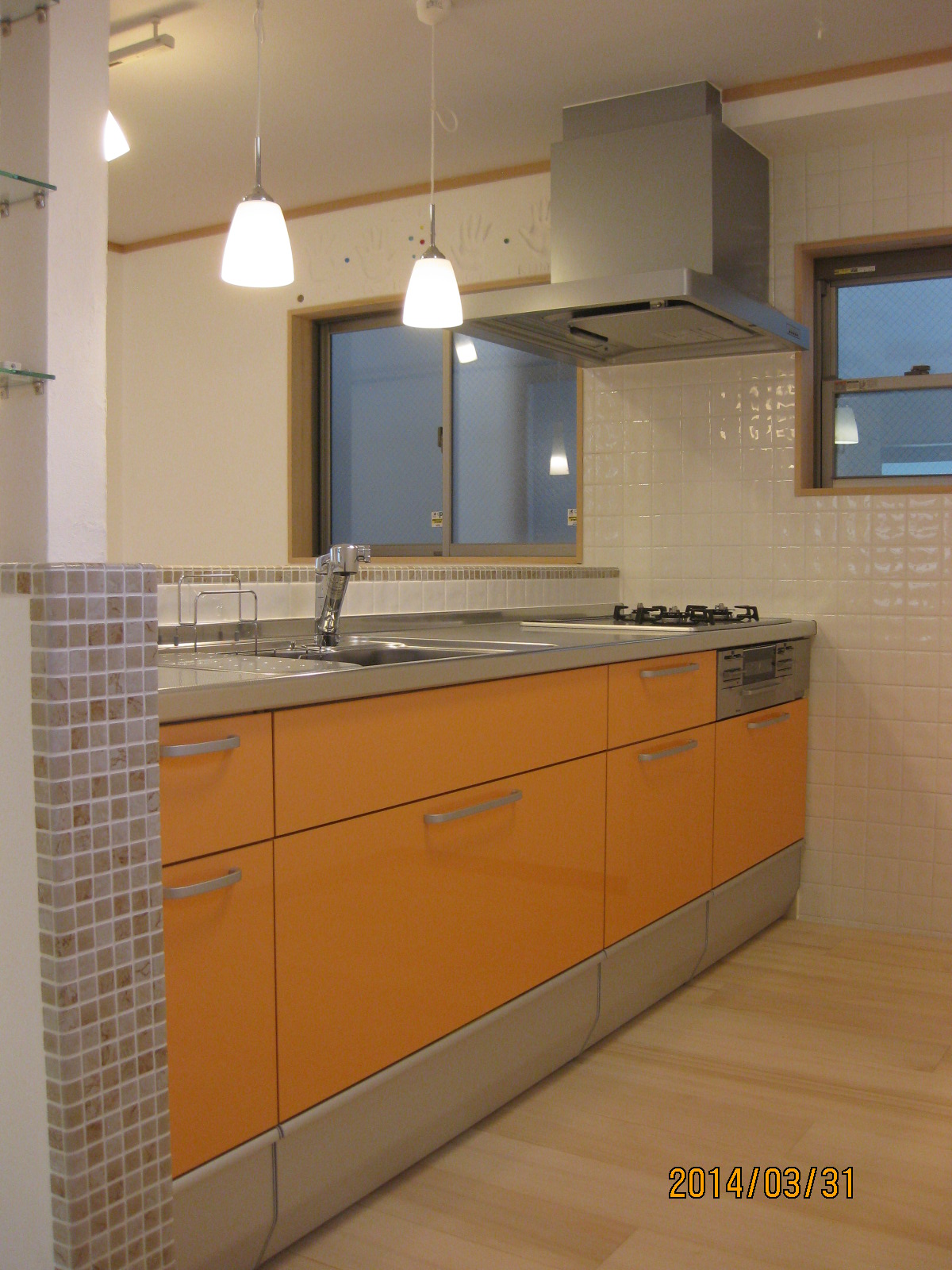 オレンジ系の明るいキッチンが真っ白な漆喰の壁に
