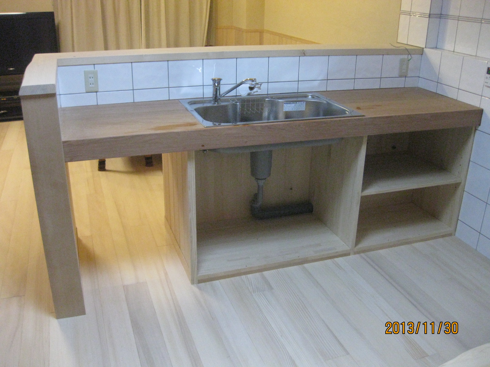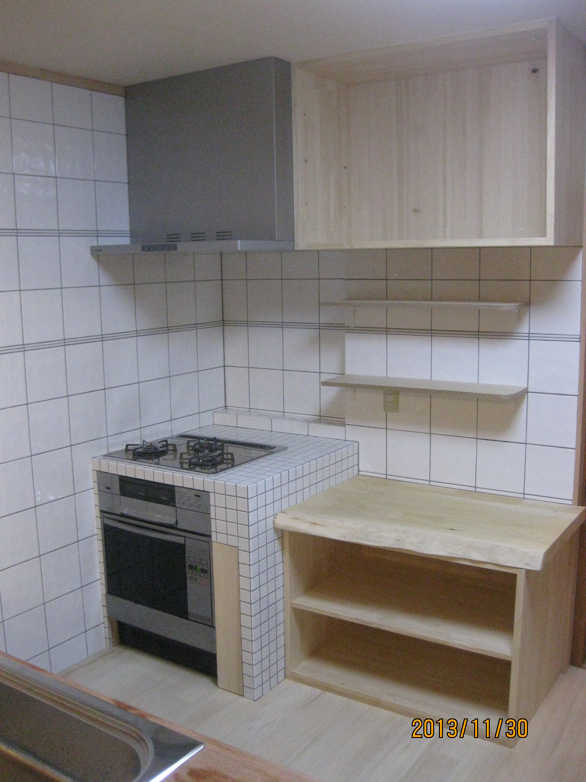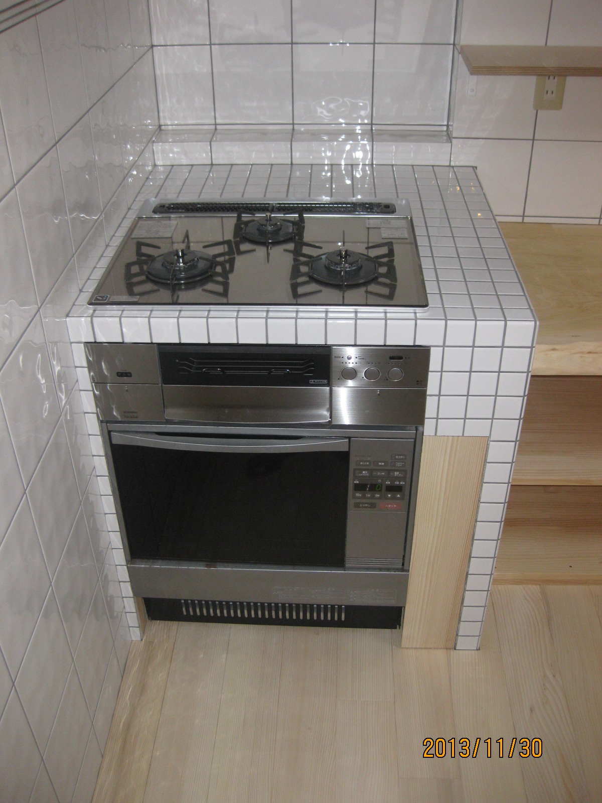 ガスコンロ台はシンクの向かい側、タイルで造りました。
