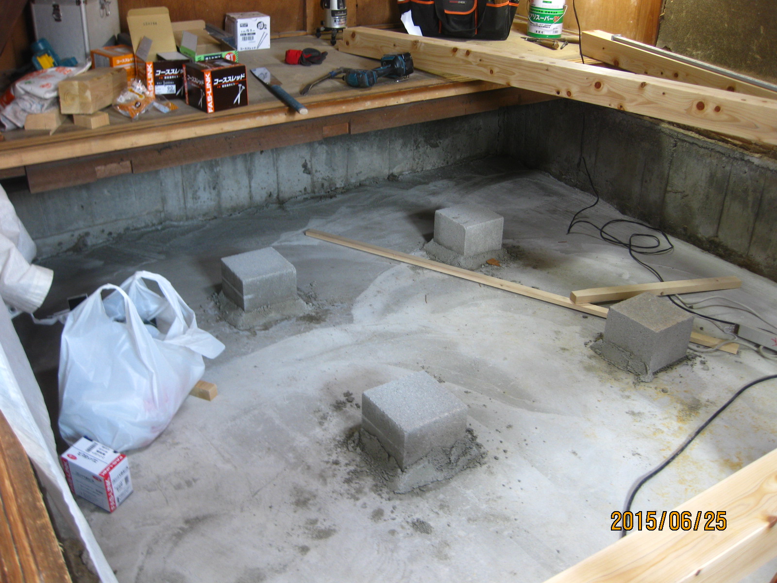 流し込んで、ついでに和室の下も、防湿コンクリート仕上げに。